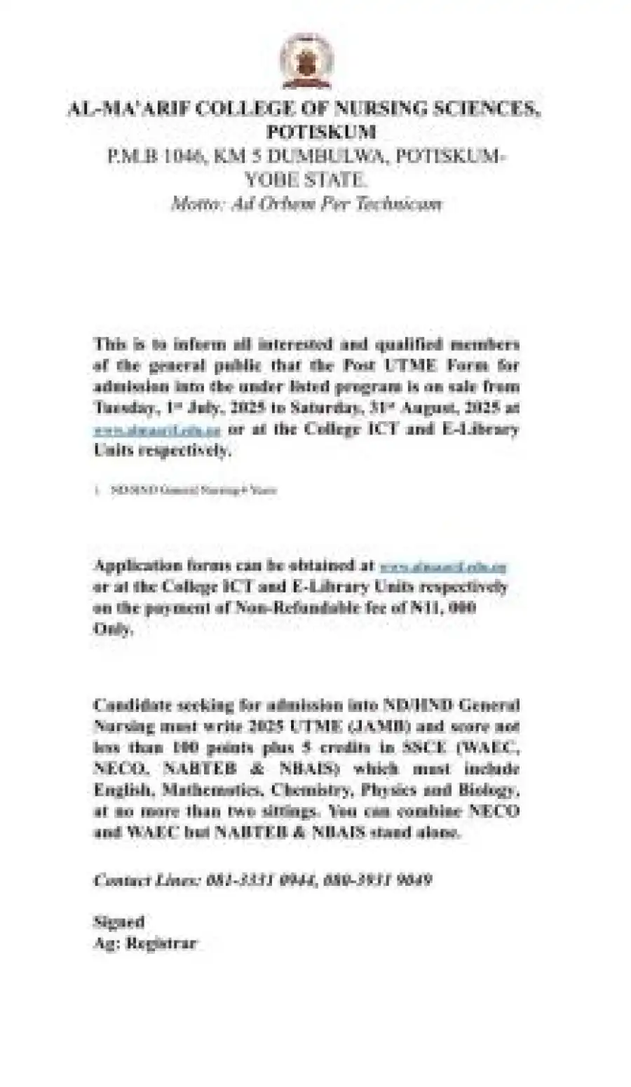 This is to inform all interested and qualified members of the general public that the Post-UTME Form for admission into the ND/HND Nursing Programme of the Al-Ma'arif College of Nursing Sciences for the 2025/2026 Academic Session is on sale from 1st July, 2025 to Saturday, 31st August, 2025 at www.almaarif.edu.ng or at the College ICT and E-Library Units respectively.