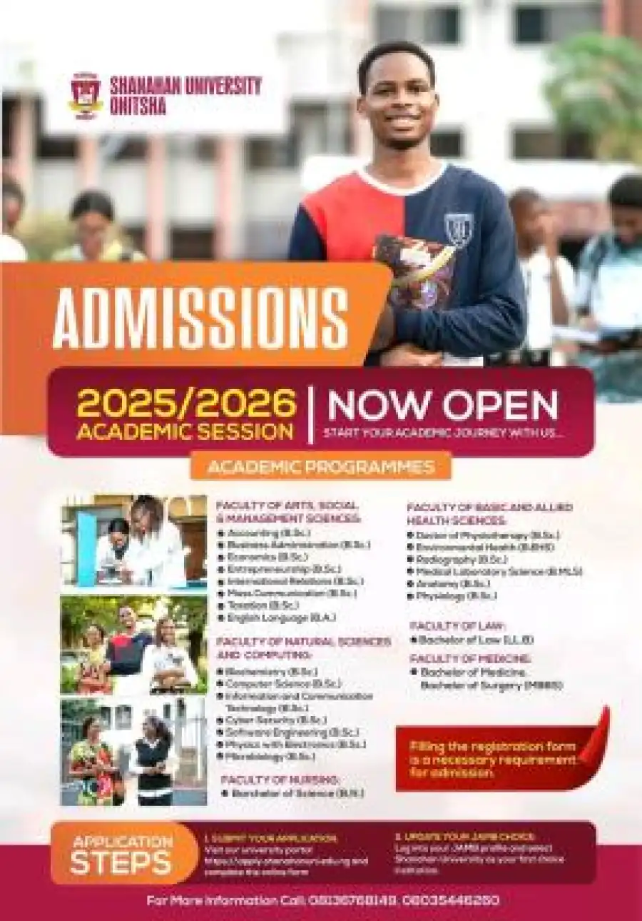 This is to inform the general public especially prospective students of Shanahan University that the management of the university has announced Post-UTME/DE admission screening for the 2025/2026 Academic Session.
