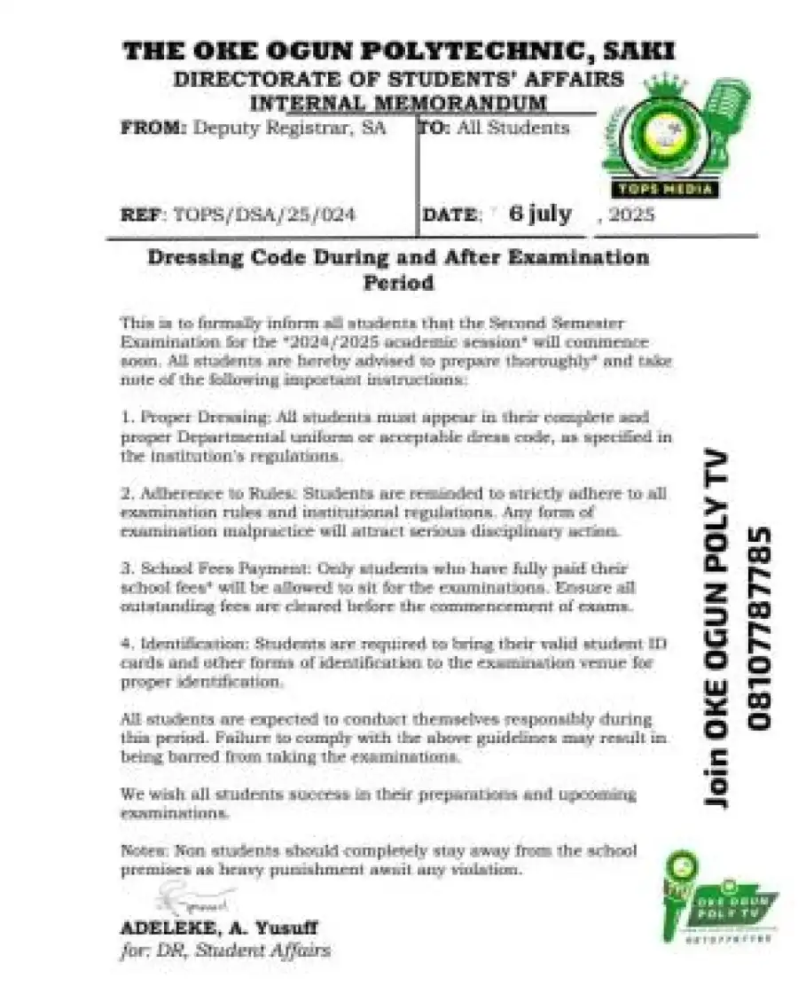 The management of The Oke-Ogun Polytechnic, Saki (TOPS) wishes to formally inform all students that the second semester examination for the 2024/2025 Academic Session will commence soon. All students are hereby advised to prepare thoroughly and take note of the following important instructions;