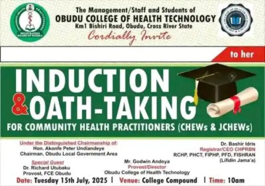 The Management, Staff and Students of the Obudu College of Health Technology cordially invites the general public to her Induction/Oath-Taking Ceremony for Graduating Community Health Practitioners (CHEWs & JCHEWs). The event has been scheduled to take place as follows;