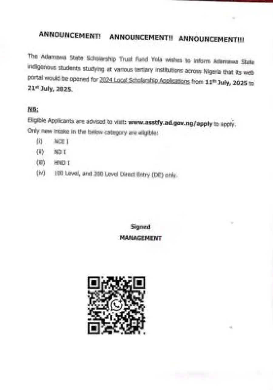 The Adamawa State Scholarship Trust Fund Yola wishes to inform Adamawa State indigenous students studying at various tertiary institutions across Nigeria that its web portal would be opened for 2024 Local Scholarship Applications from 11th July, 2025 to 21st July, 2025.