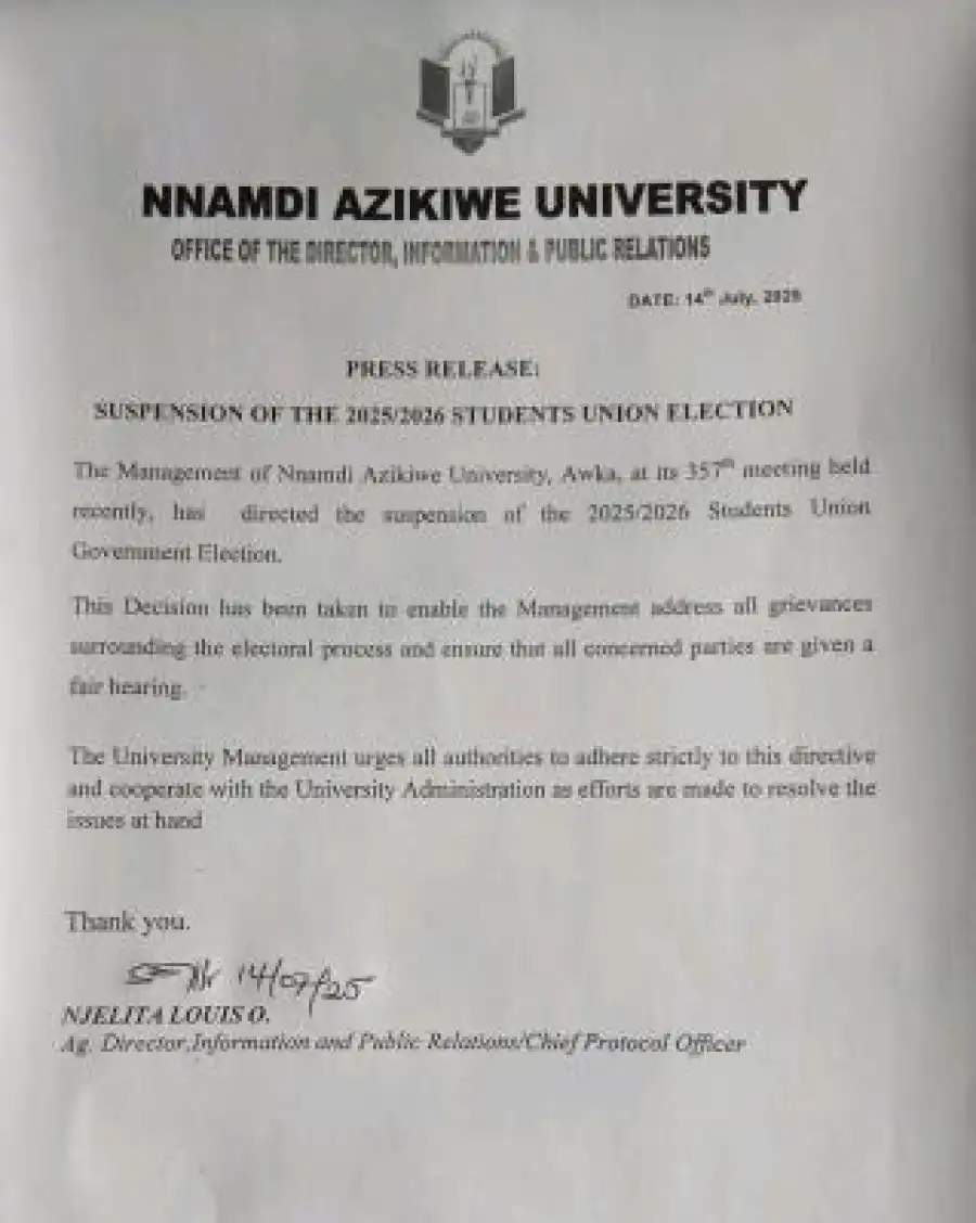 The Management of Nnamdi Azikiwe University, Awka, at its 357th meeting held recently, has directed the suspension of the 2025/2026 Students Union Government Election.