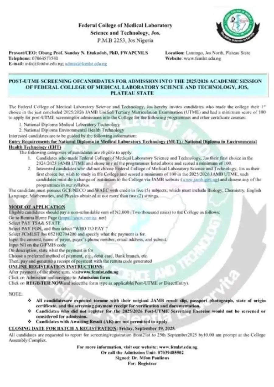 The Federal College of Medical Laboratory Science and Technology, Jos hereby invites candidates who made the college their 1st choice in the just concluded 2025/2026 JAMB Unified Tertiary Matriculation Examination (UTME) and had a minimum score of 100 to apply for Post-UTME screening for admissions into the College for the following Programmes and other certificate courses: