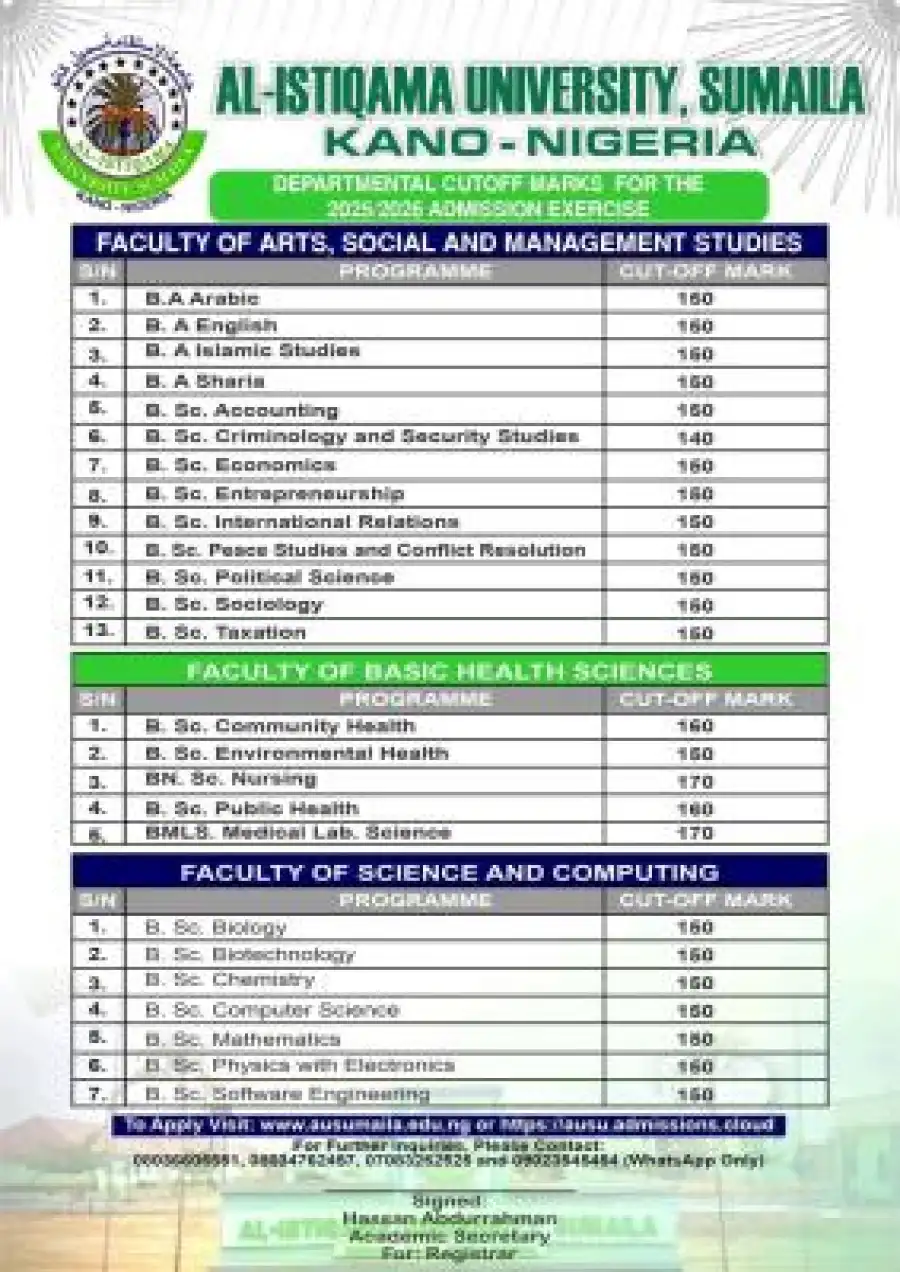 This is to inform the general public especially prospective candidates of the Al-Istiqama University that the school management has released the departmental cut-off marks for the 2025/2026 academic session admission