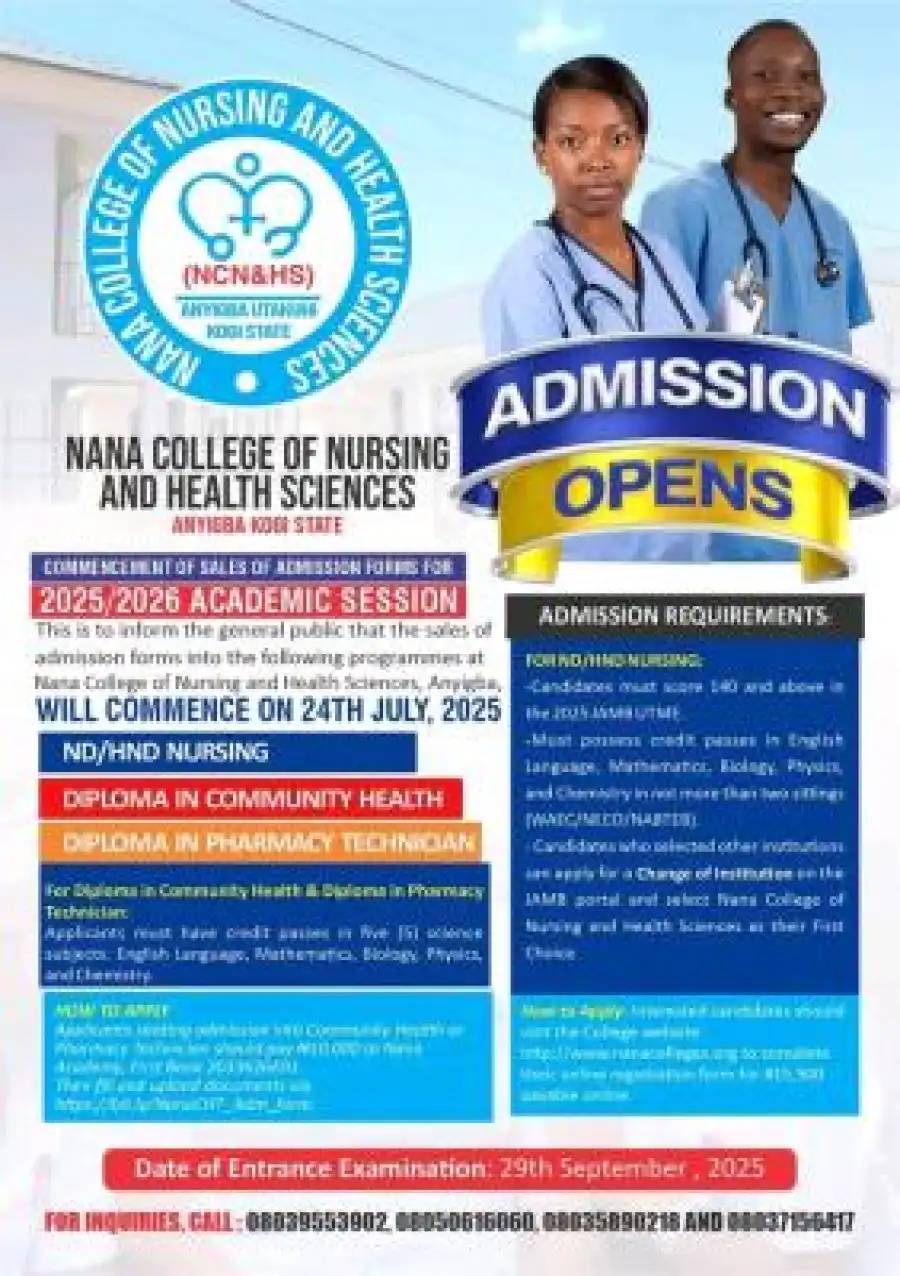 This is to inform the general public that the sales of admission forms into the following programmes at Nana College of Nursing and Health Sciences, Anyigba, is now on sale.