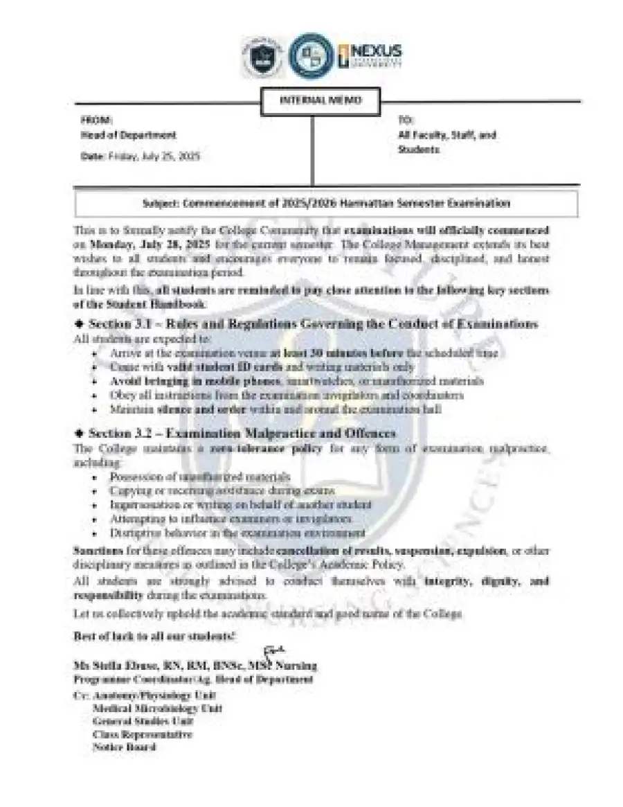 This is to formally notify the College Community that examinations will officially commenced on Monday, July 28th, 2025 for the current semester. The College Management extends its best wishes to all students and encourages everyone to remain focused, disciplined, and honest throughout the examination period.