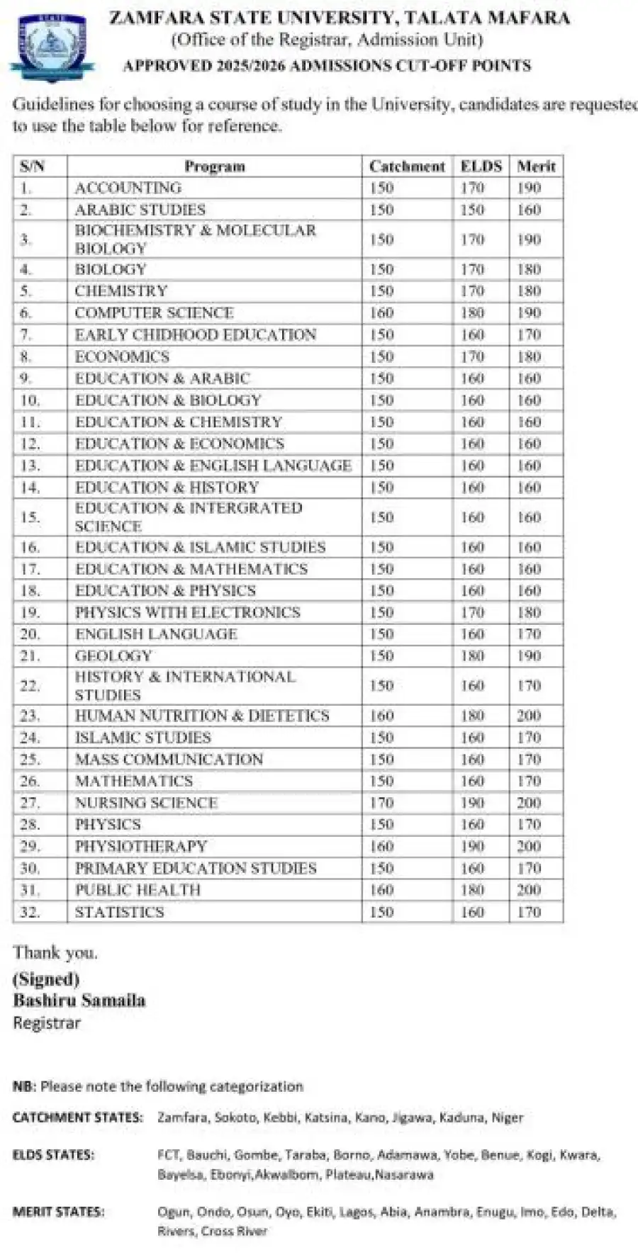This is to inform the general public especially prospective candidates of the Zamfara State University the university management has released the approved admission cut-off marks for various Departments of the University for the 2026/2026 Academic Session.