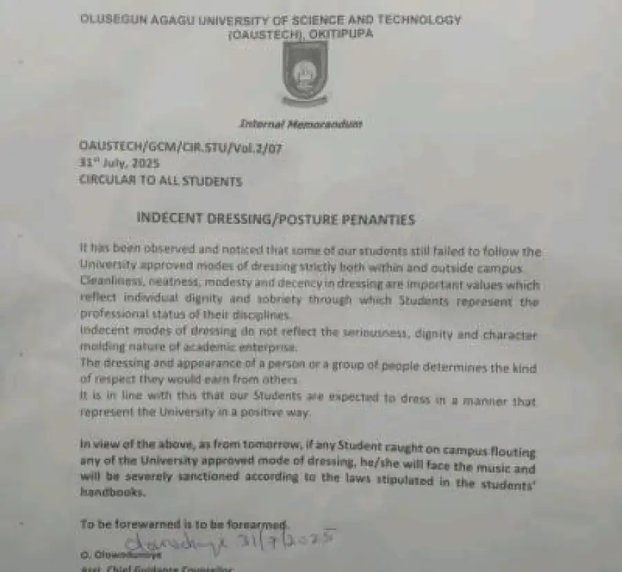 It has been observed and noticed that some of our students still failed to follow the University approved modes of dressing strictly both within and outside campus.