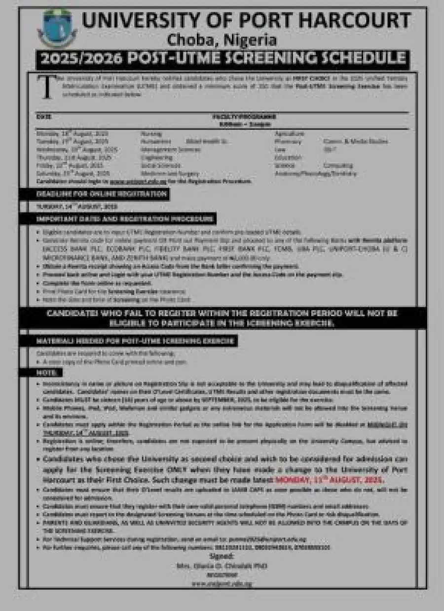 The University of Port Harcourt hereby notifies all candidates who chose the University as their First Choice in the 2025 Unified Tertiary Matriculation Examination (UTME) and obtained a minimum score of 150, that the Post-UTME Screening Exercise has been scheduled as follows: