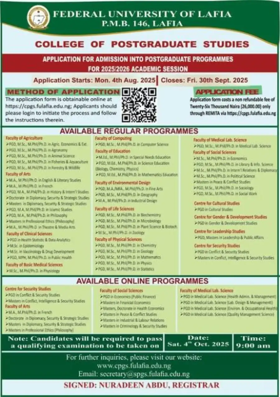 The Federal University of Lafia (FULAFIA) invites interested candidates to apply for Postgraduate Studies for its online and onsite programmes for the 2025/2026 Academic Session. Available courses are to be viewed on the attached flier.