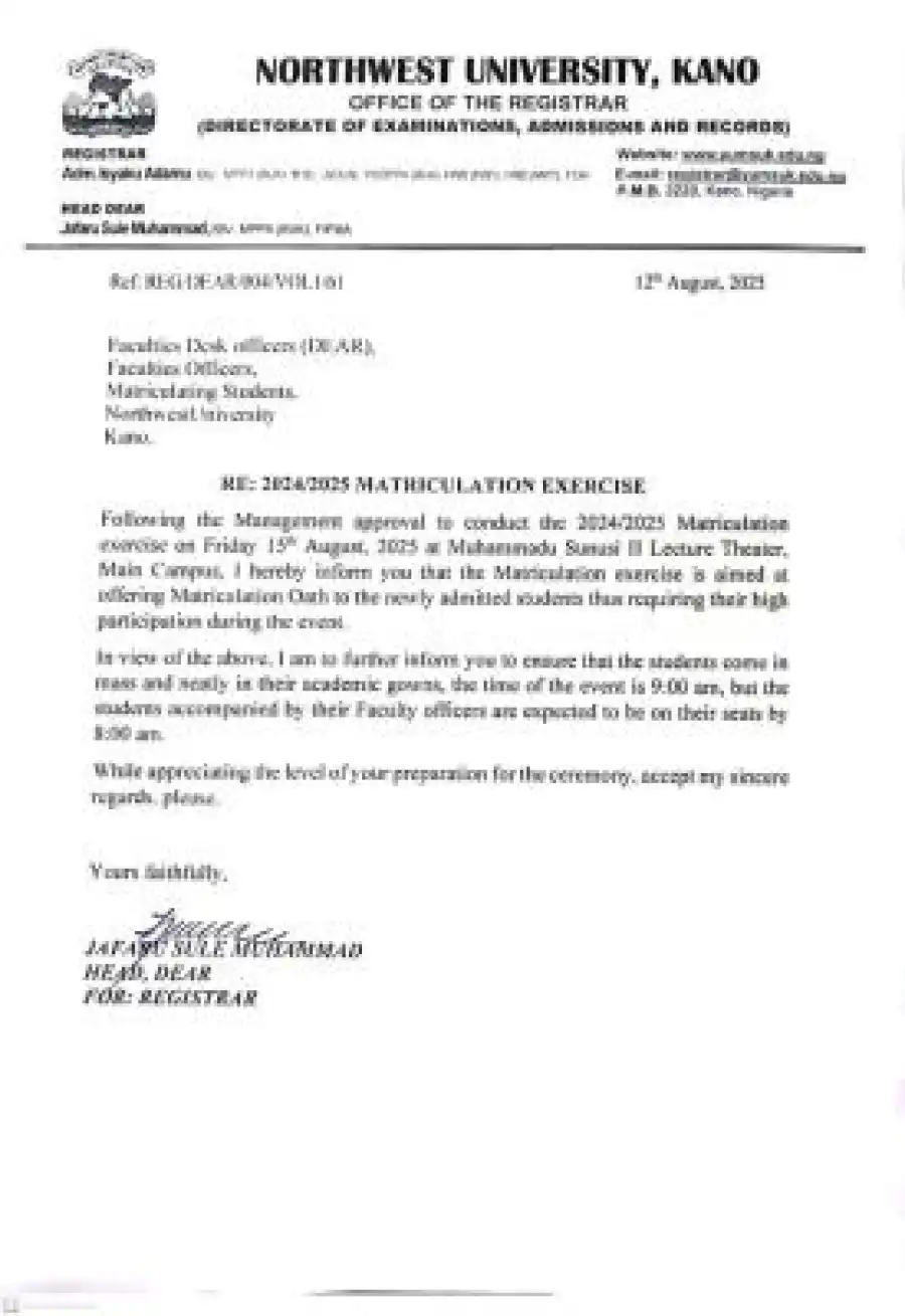Following the Management approval to conduct the 2024/2025 Matriculation exercise on Friday 15th August, 2025 at Muhammadu Sunusi II Lecture Theater, Main Campus. I hereby inform you that the Matriculation exercise is aimed at offering Matriculation Oath to the newly admitted students thus requiring their high participation during the event.