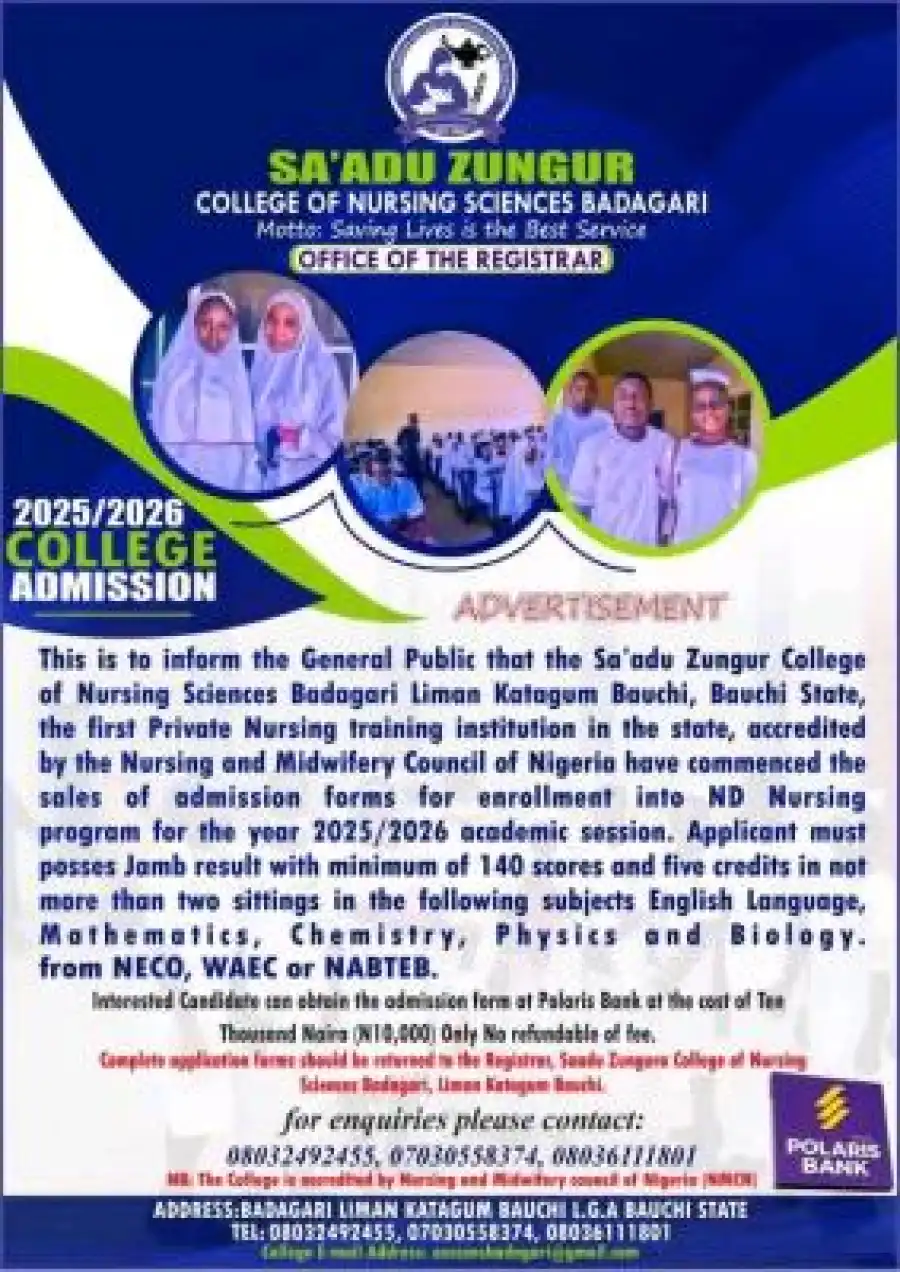 This is to inform the General Public that the Sa'adu Zungur College of Nursing Sciences Badagari Liman Katagum Bauchi, Bauchi State, the first Private Nursing training institution in the state, accredited by the Nursing and Midwifery Council of Nigeria have commenced the sales of admission forms for enrollment into ND Nursing program for the year 2025/2026 academic session. Applicant must posses Jamb result with minimum of 140 scores and five credits in not more than two sittings in the following subjects English Language, Mathematics, Chemistry, Physics and Biology. from NECO, WAEC or NABTЕВ.
