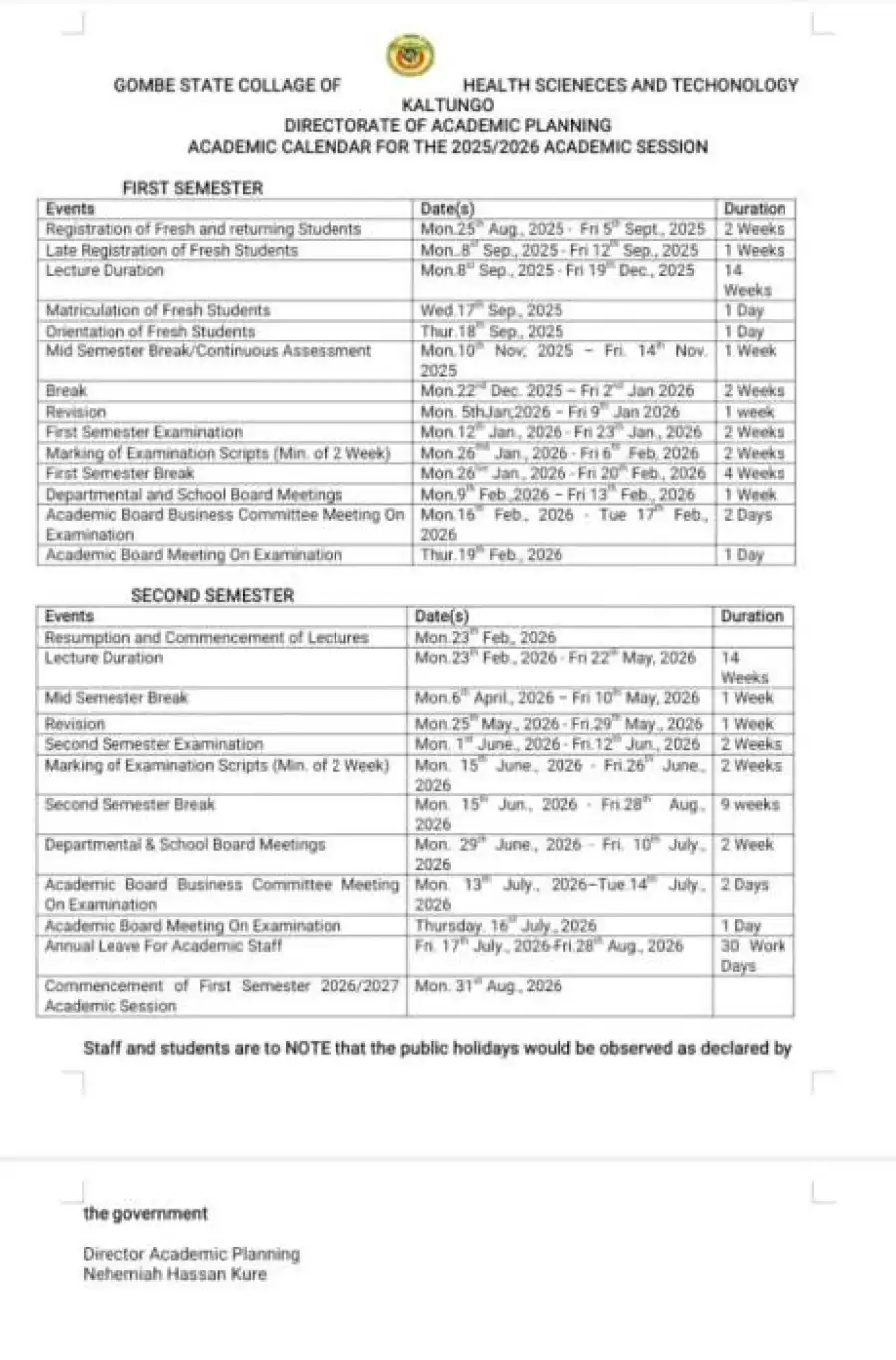 Gombe College of Health Tech releases academic calendar, 2025/2026