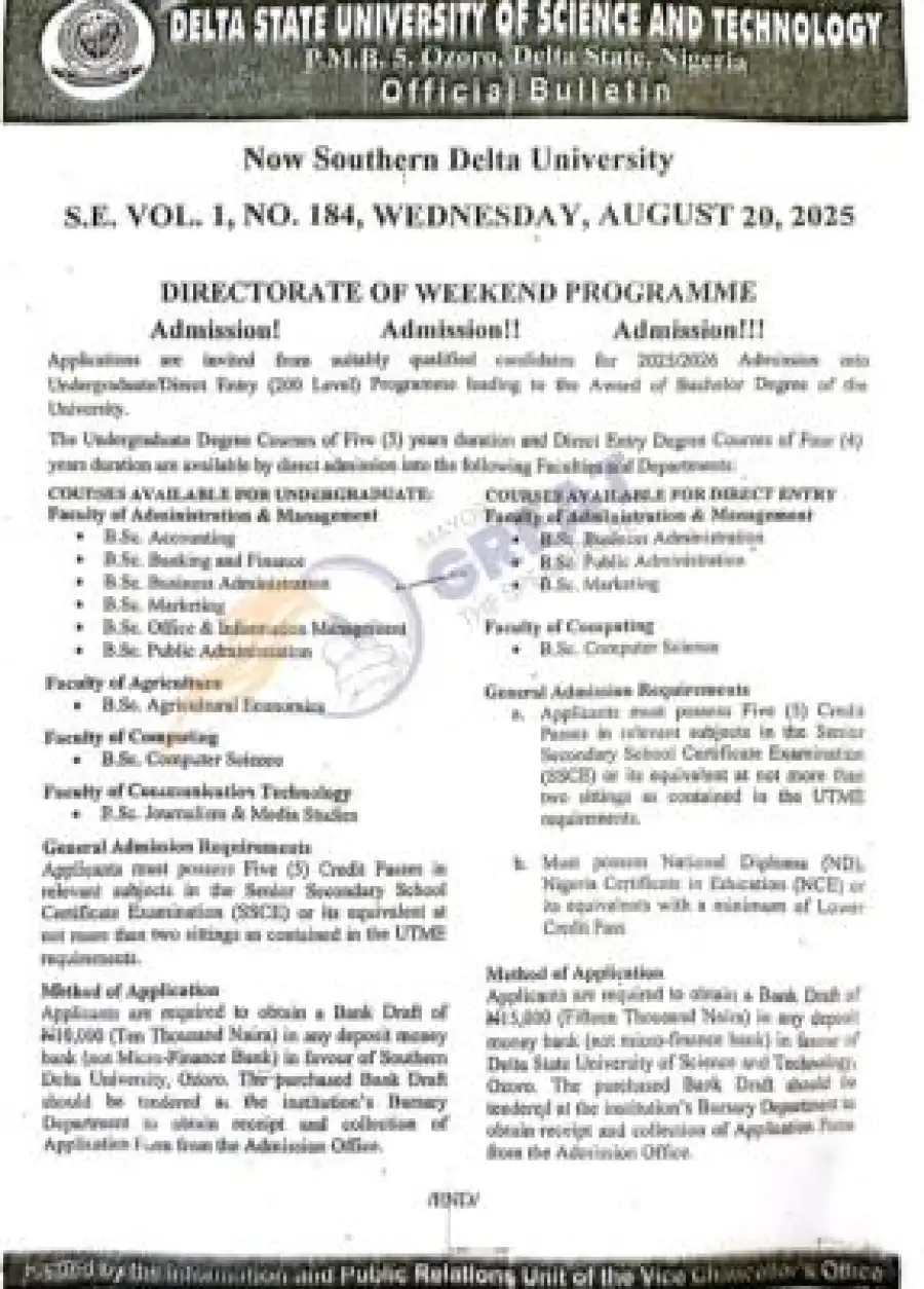 Applicants are required to obtain a Bank Draft of ₩10,000 (Ten Thousand Naira) in any deposit money bank (not Micro-Finance Bank) in favour of Southern Delta University, Ozoro. The purchased Bank Draft should be tendered as the institution's. Bursary Department to obtain receipt and collection of Application Form from the Admission Office
