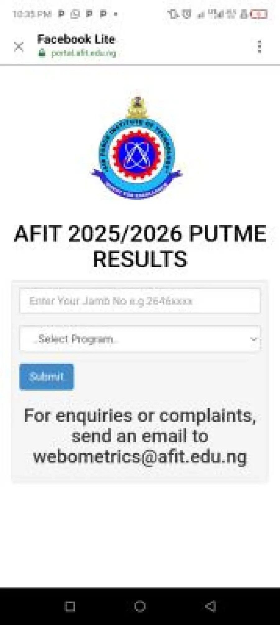 Visit the AFIT official portal at portal.afit.edu.ng/putme_result