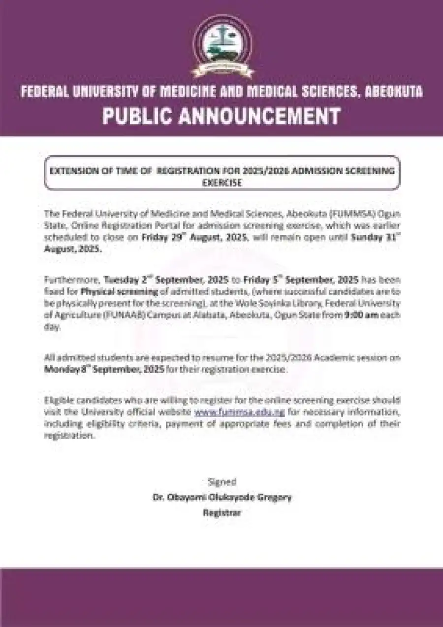 The Federal University of Medicine and Medical Sciences, Abeokuta (FUMMSA), Ogun State, online registration portal for admission screening exercise, which was earlier scheduled to close on Friday 29th August, 2025, will remain open until Sunday 31st August, 2025.