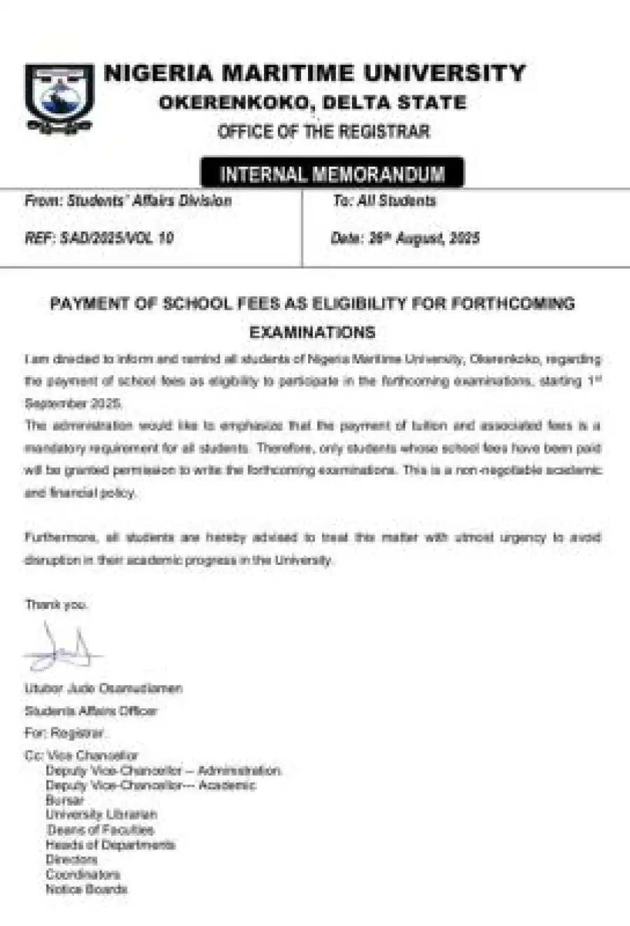 This is to inform and remind all students of Nigeria Maritime University, Okerenkoko, regarding the payment of school fees as eligibility to participate in the forthcoming examinations, starting 1st September 2025.