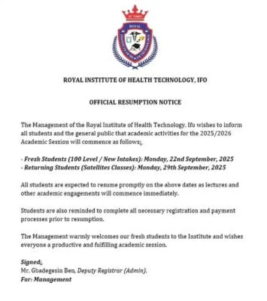 The Management of the Royal Institute of Health Technology, Ifo wishes to inform all students and the general public that academic activities for the 2025/2026 academic session will commence as follows: