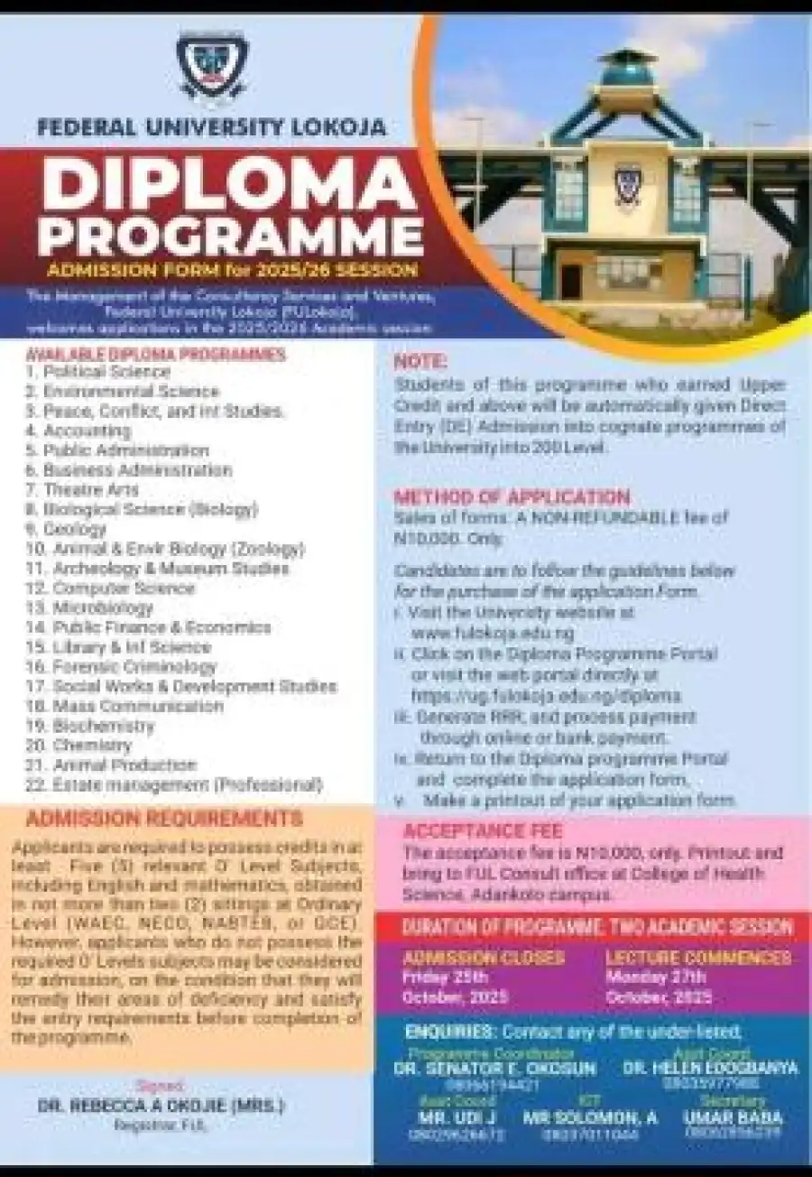 The Management of the Federal University Lokoja (FULokoja), invites applications from suitably qualified candidates for admission into the various Diploma Programmes of the University for the 2025/2026 Academic Session.