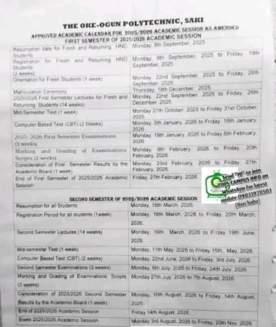 This is to inform the newly Admitted students of the Oke Ogun Polytechnic that the management has released approved academic calendar for the first semester and second semester of the 2025/2026 academic session