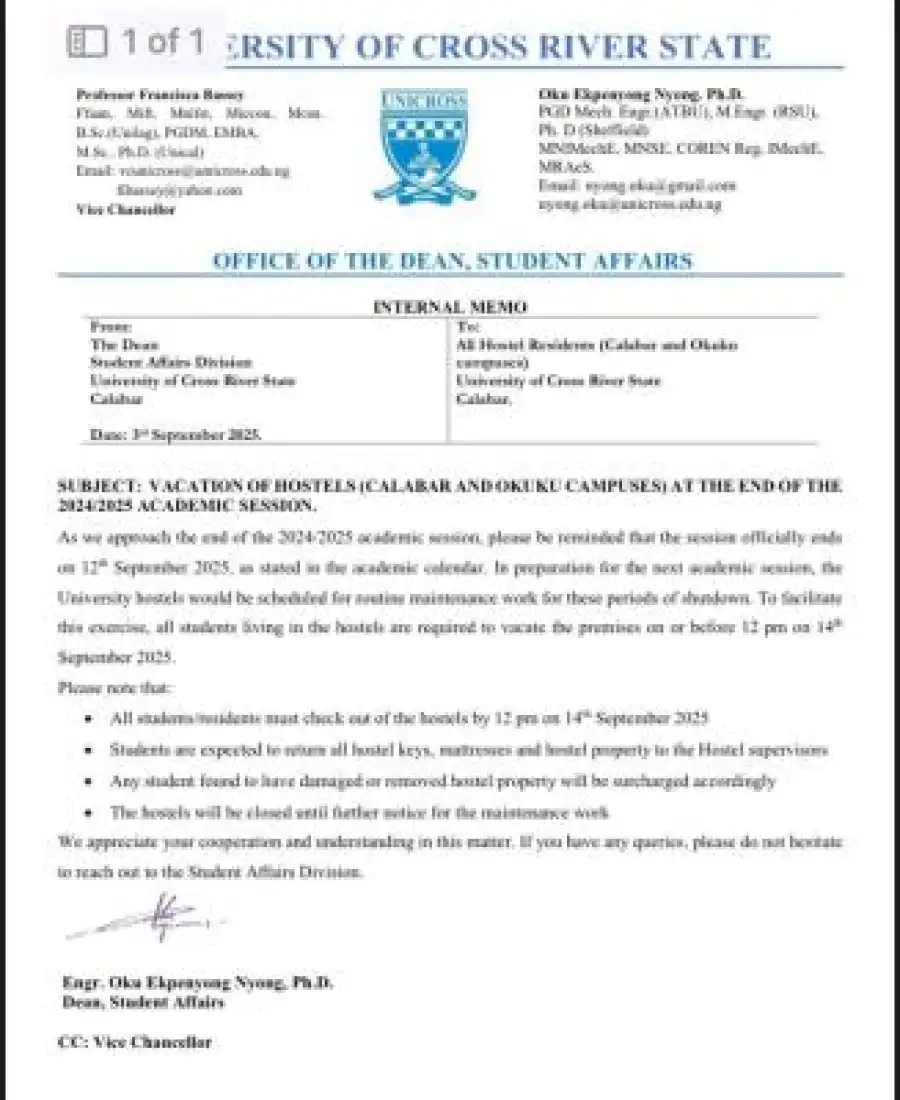 As we approach the end of the 2024/2025 academic session, please be reminded that the session officially ends on 12th September 2025, as stated in the academic calendar. In preparation for the next academic session, the University hostels would be scheduled for routine maintenance work for these periods of shutdown. To facilitate this exercise, all students living in the hostels are required to vacate the premises on or before 12 pm on 14th September 2025.