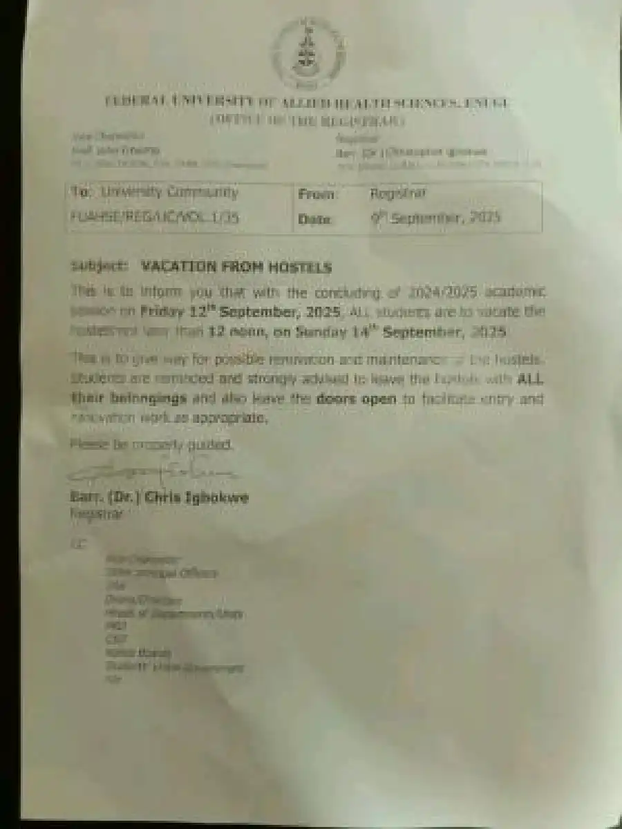 This is to inform all students of the Federal University of Health and Allied Health Sciences, Enugu that with the conclusion of the 2024/2025 academic session on Friday 12th September, 2025, all students are to vacate the hostels not later than 12 noon, on Sunday 14th September, 2025.