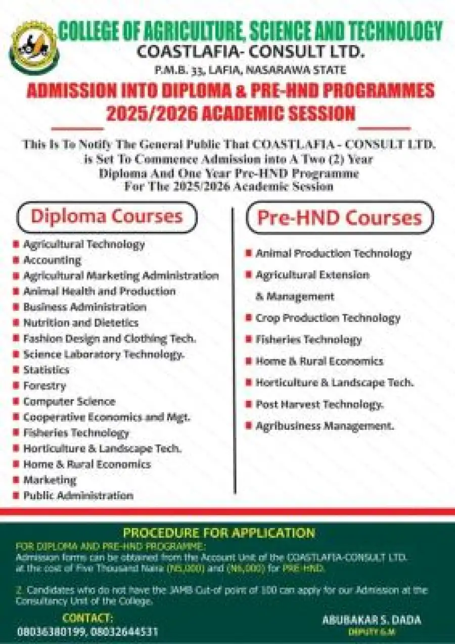 The College of Agriculture, Science and Technology, Lafia, Nasarawa State has officially announced the commencement of admission into its Diploma and Pre-HND Programmes for the 2025/2026 Academic Session.