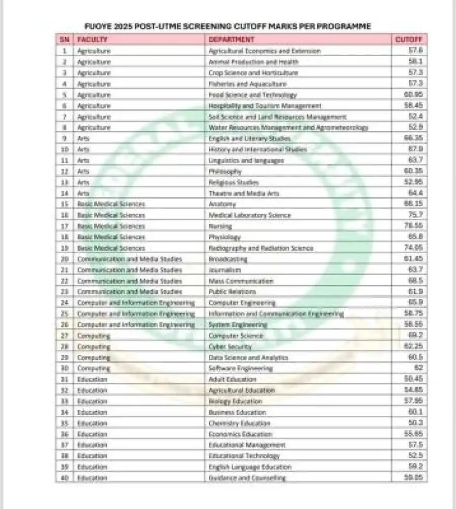 The Management of the Federal University Oye-Ekiti has released the official departmental cut-off marks for the 2025/2026 Post-UTME screening exercise. The cut-off marks were approved following a careful assessment of applicants’ performance, competitiveness of programmes, and admission quotas.