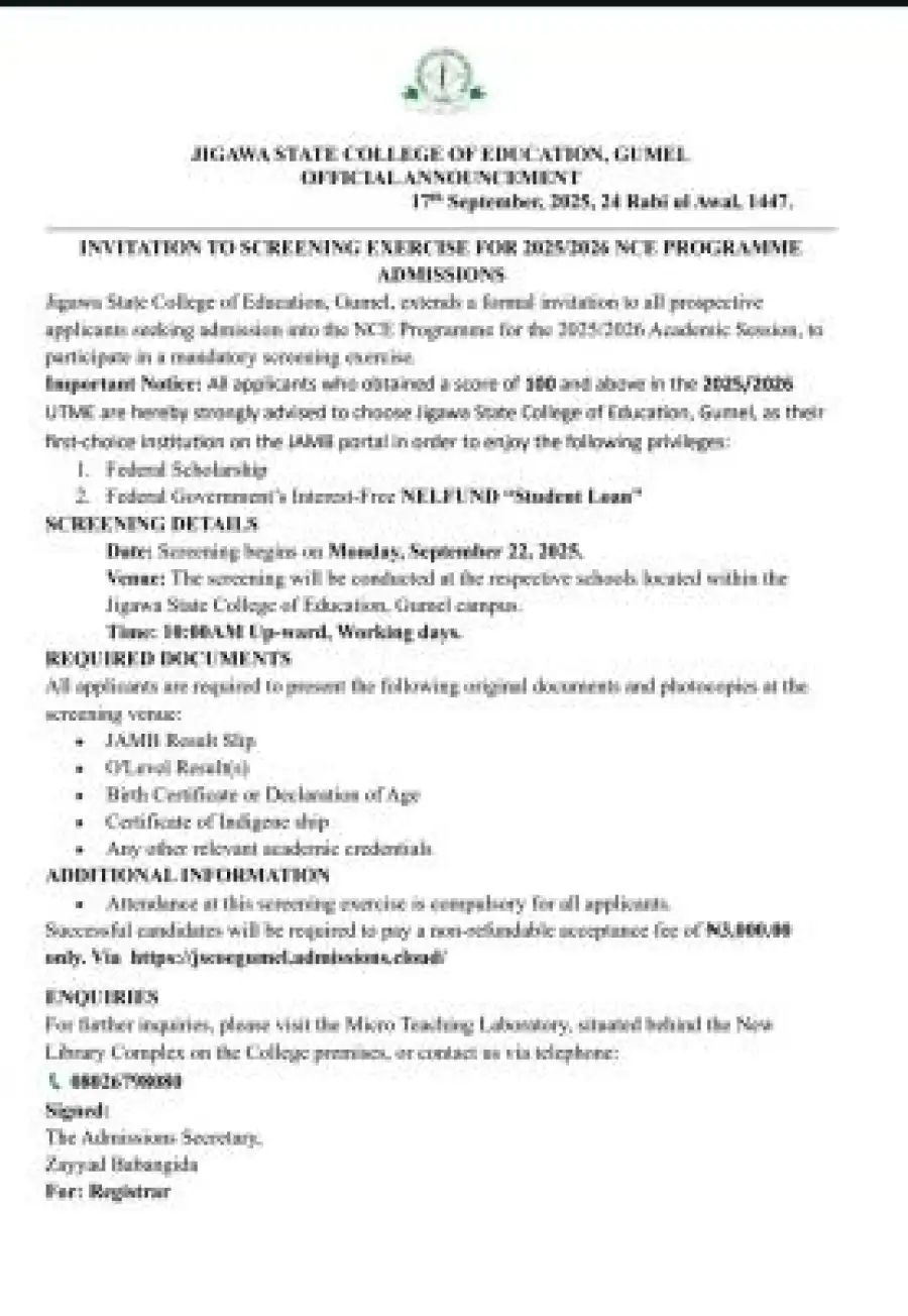 Jigawa State College of Education, Gumel, extends a formal invitation to all prospective applicants seeking admission into the NCE Programme for the 2025/2026 Academic Session, to participate in a mandatory screening exercise.