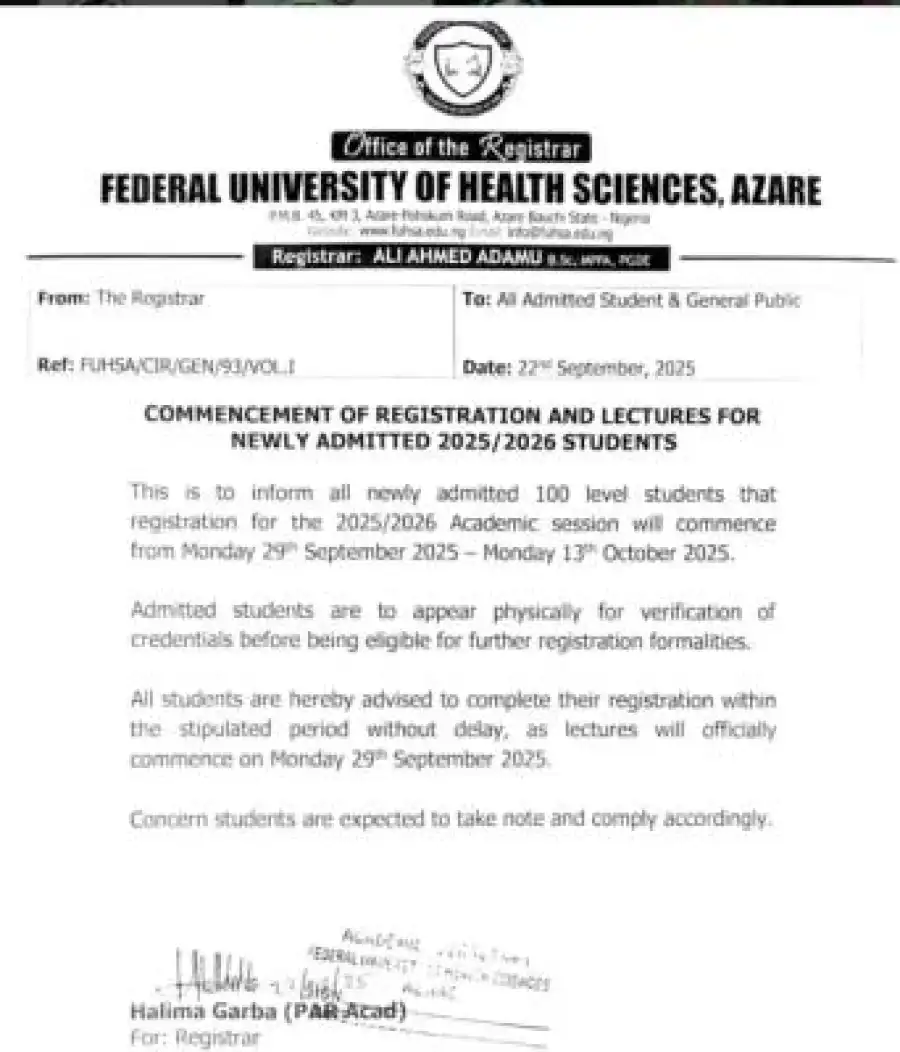 FUHSA notice on commencement of registration and lectures for newly admitted students, 2025/2026