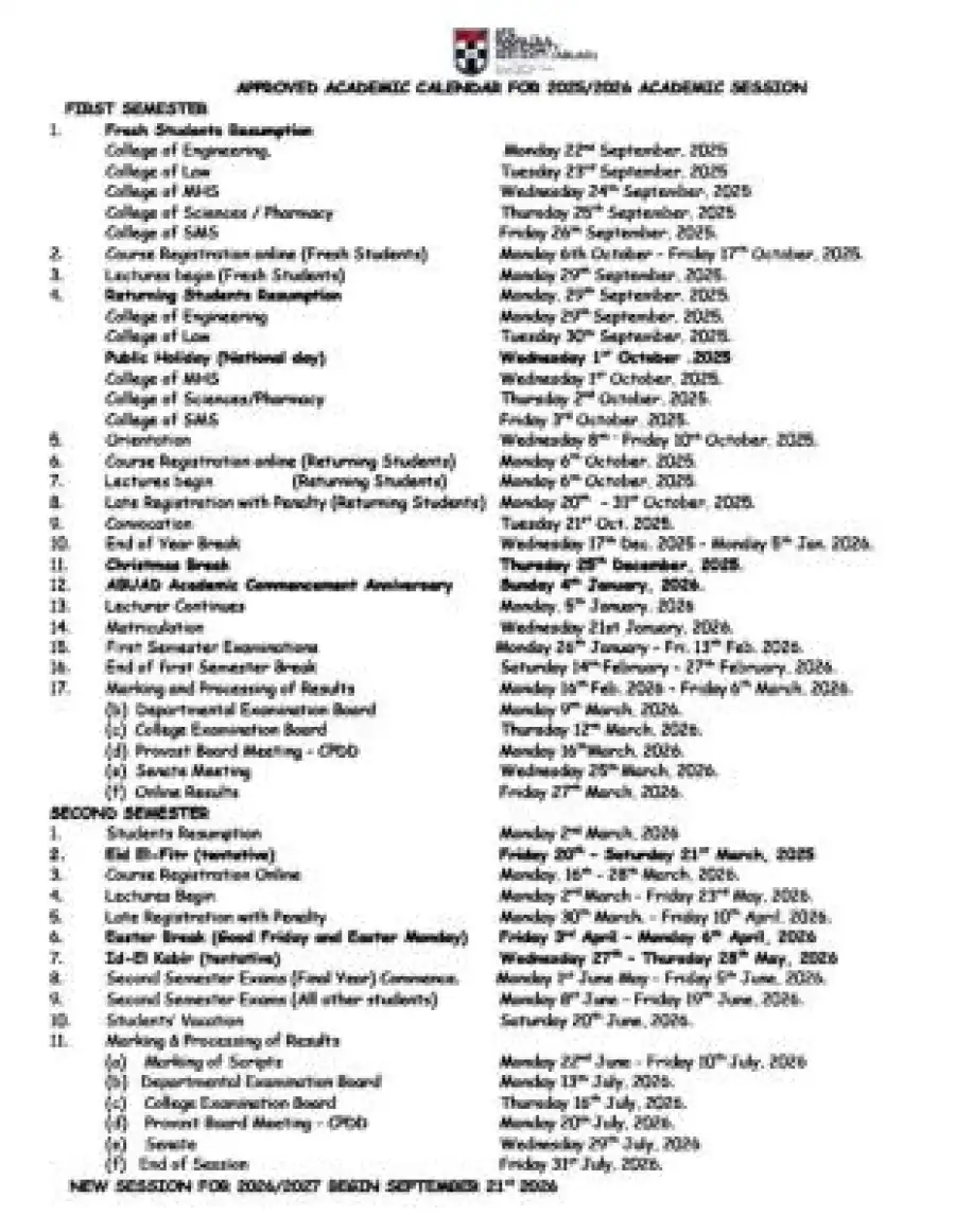 Afe Babalola University, Ado-Ekiti (ABUAD) has officially released the approved academic calendar for the 2025/2026 academic session.
