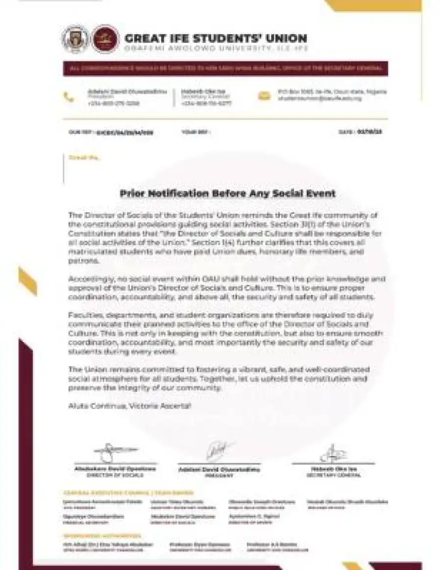 Accordingly, no social event within OAU shall hold without the prior knowledge and approval of the Union’s Director of Socials and Culture. This is to ensure proper coordination, accountability, and above all, the security and safety of all students.