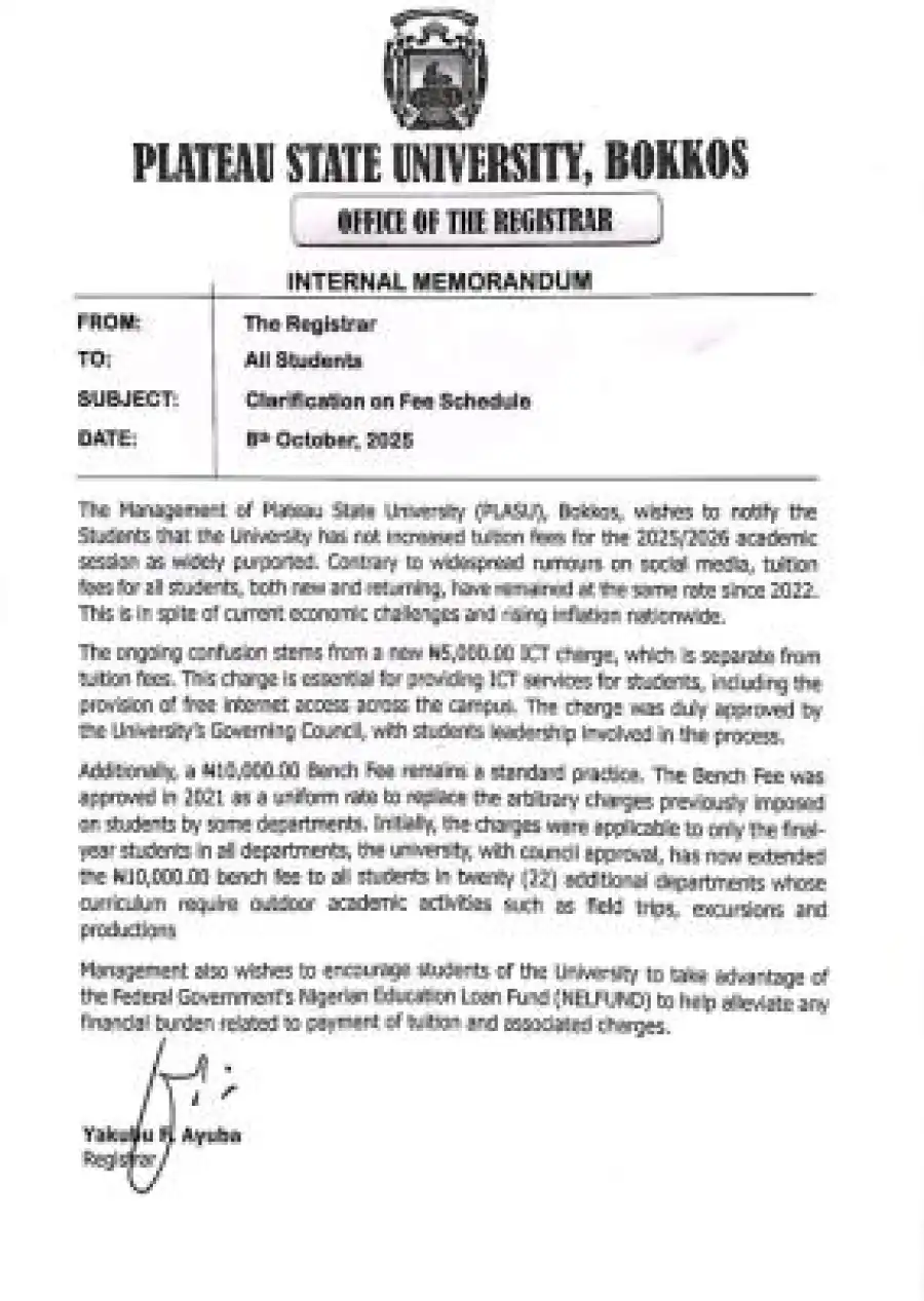 The management of Plateau State University (PLASU), Bokkos, has clarified that there has been no increase in tuition fees for the 2025/2026 academic session, contrary to reports circulating on social media.