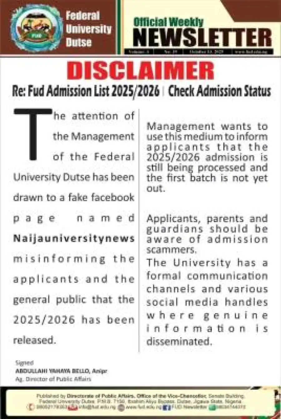 The management of the Federal University Dutse (FUD) has alerted the public to a fake Facebook post that is falsely claiming the release of the university’s 2025/2026 admission list.