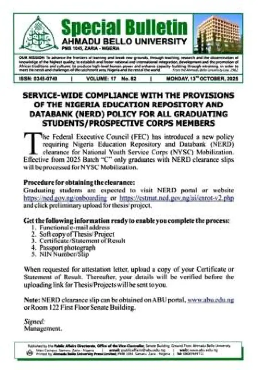 The management of Ahmadu Bello University (ABU), Zaria, has released a special bulletin informing all graduating students and prospective corps members about the new Nigeria Education Repository and Databank (NERD) policy, recently approved by the Federal Executive Council (FEC).
