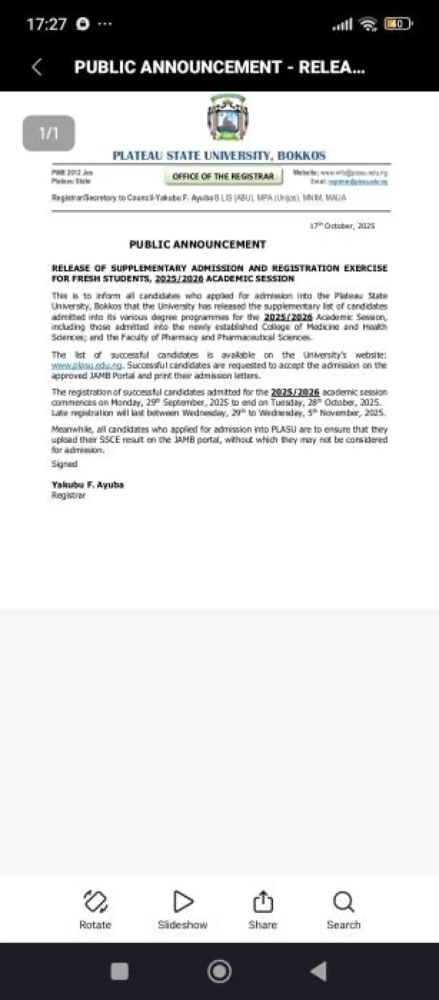 PLASU supplementary admission list and registration details, 2025/2026