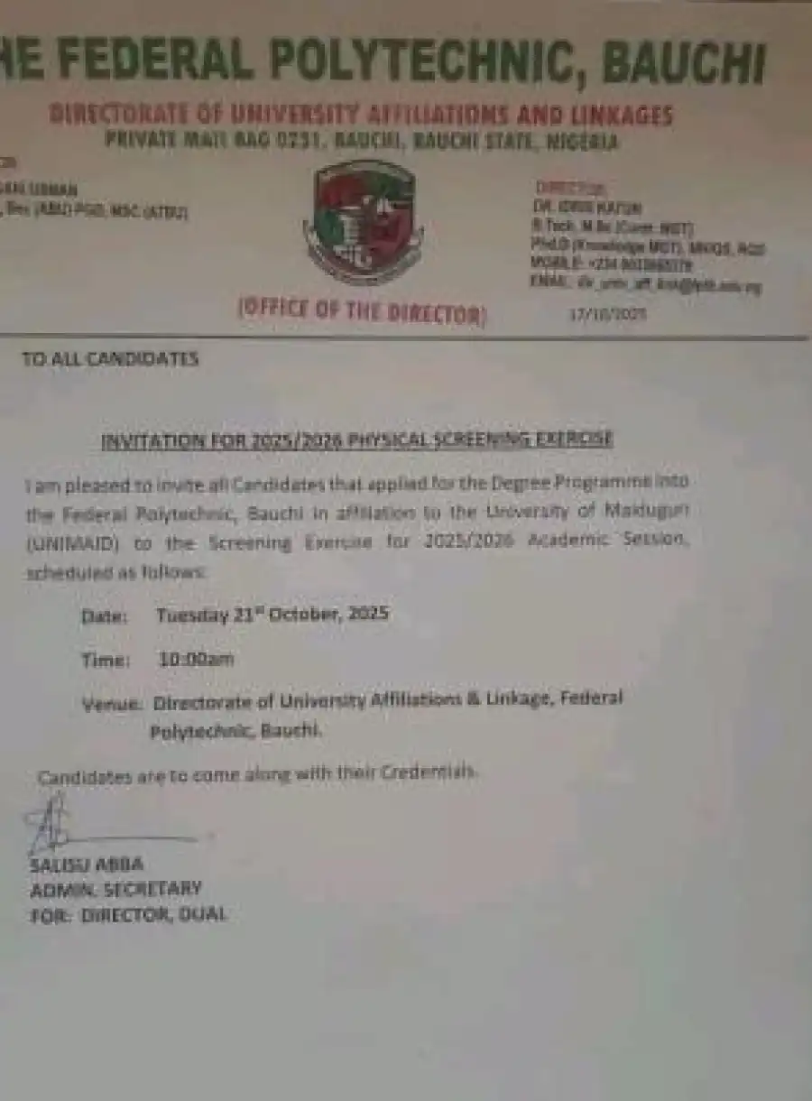 The Federal Polytechnic, Bauchi, through its Directorate of University Affiliations and Linkages, has officially announced the date for the physical screening exercise for candidates who applied for admission into its Degree Programme in affiliation with the University of Maiduguri (UNIMAID).