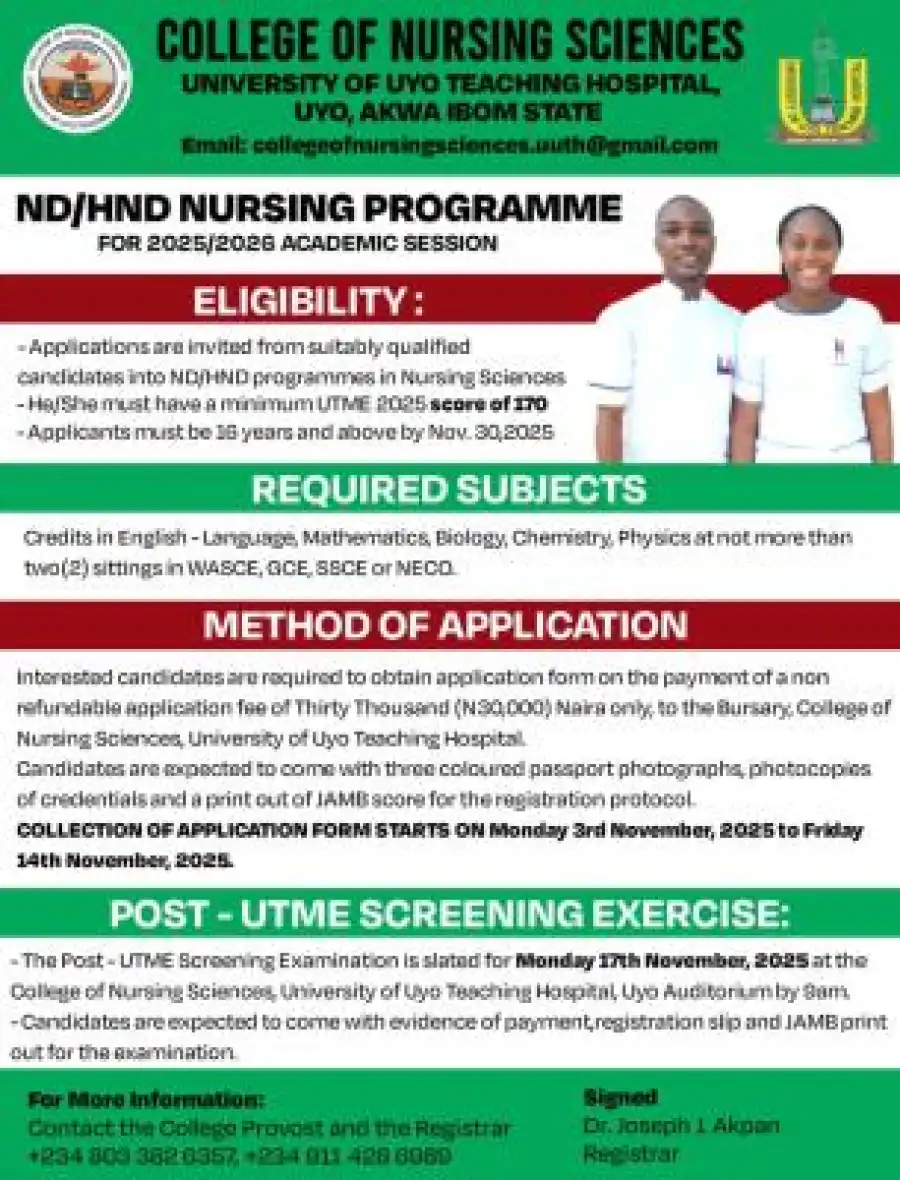The College of Nursing Sciences, University of Uyo Teaching Hospital (UUTH), Uyo, Akwa Ibom State, has officially announced the commencement of its admission process for suitably qualified candidates into the National Diploma (ND) and Higher National Diploma (HND) Nursing programmes for the 2025/2026 Academic Session.