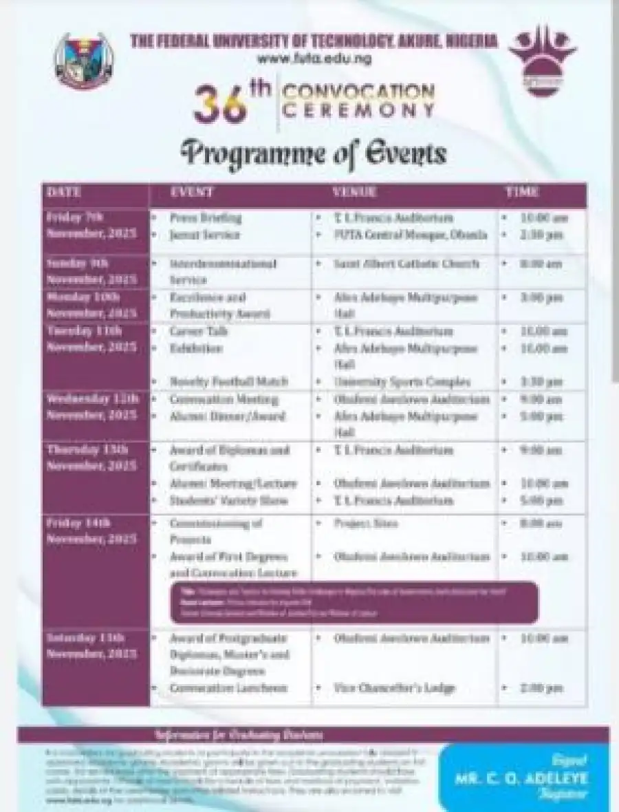 The Federal University of Technology, Akure (FUTA) is pleased to announce its highly anticipated 36th Convocation Ceremony, scheduled to take place from Friday, 7 November 2025 through Saturday, 15 November 2025.