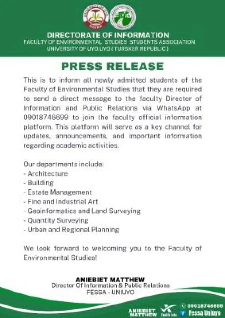 This is to inform all newly admitted students of the Faculty of Environmental Studies that they are required to send a direct message to the faculty Director of Information and Public Relations via WhatsApp at 09018746699 to join the faculty official information platform. This platform will serve as a key channel for updates, announcements, and important information regarding academic activities.
