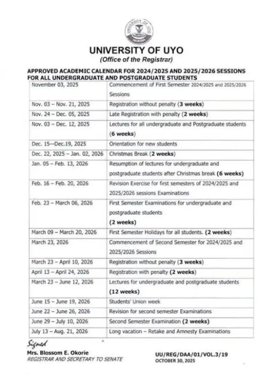 UNIUYO academic calendar for 2024/2025 & 2025/2026