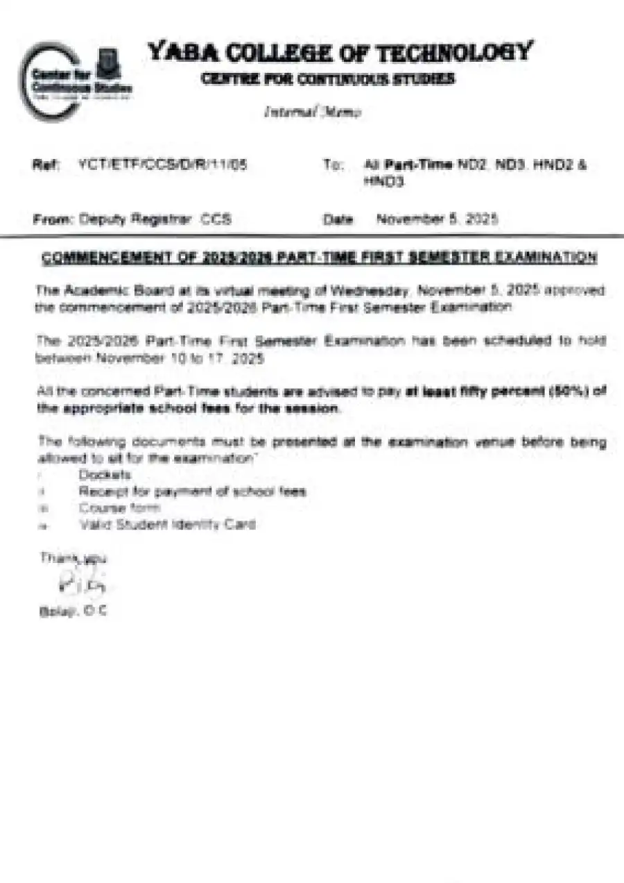 The management of Yaba College of Technology (YABATECH), Centre for Continuous Studies, has announced the commencement of the 2025/2026 Part-Time First Semester Examination.