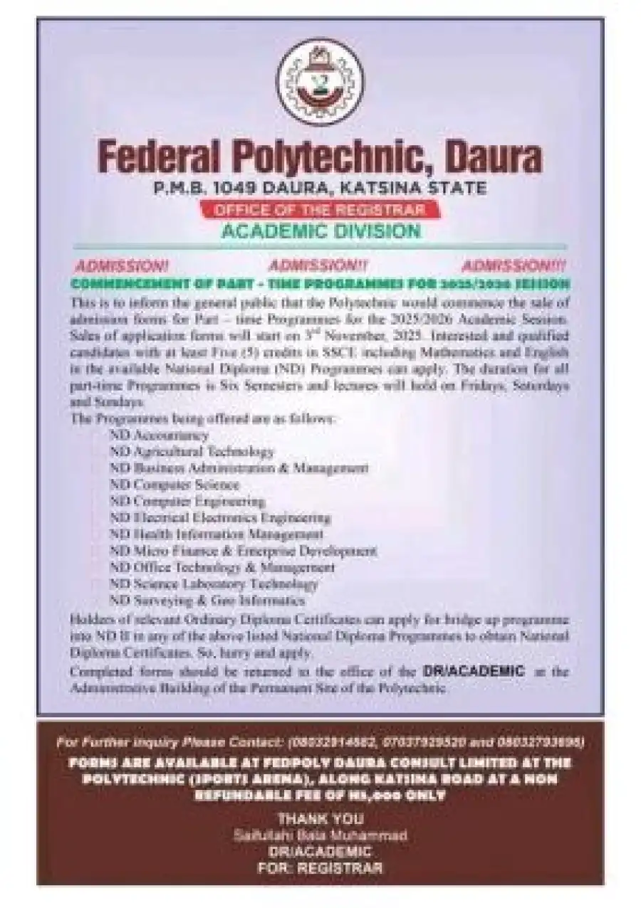 The management of Federal Polytechnic, Daura, Katsina State, has announced the commencement of the sale of admission forms for Part-Time National Diploma (ND) programmes for the 2025/2026 academic session.