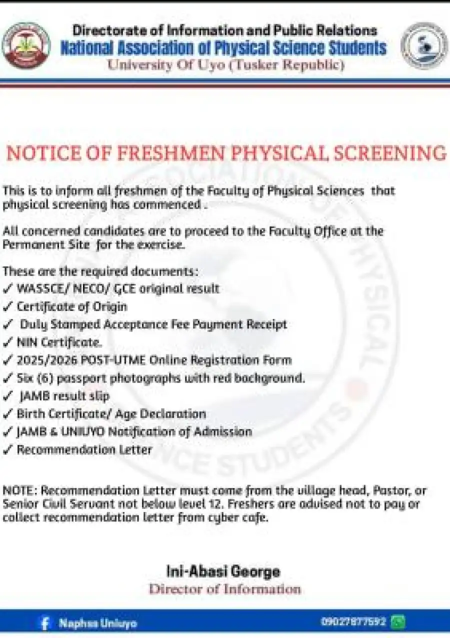 The Directorate of Information and Public Relations, National Association of Physical Science Students, University of Uyo (UNIUYO), has announced the commencement of physical screening for all freshmen in the Faculty of Physical Sciences.
