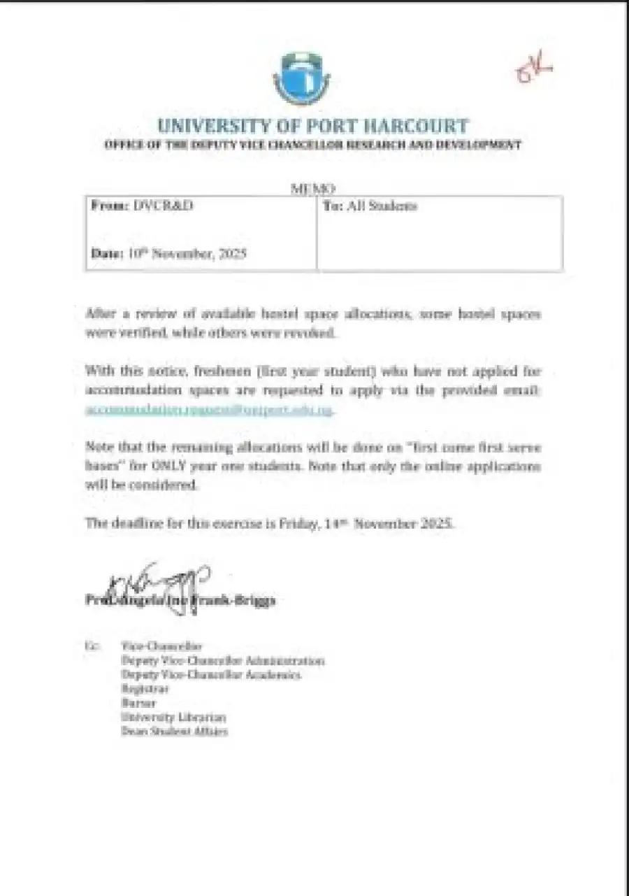 The University of Port Harcourt (UNIPORT), through the Office of the Deputy Vice-Chancellor, Research and Development, has released an important memo addressed to all students regarding hostel accommodation allocations.