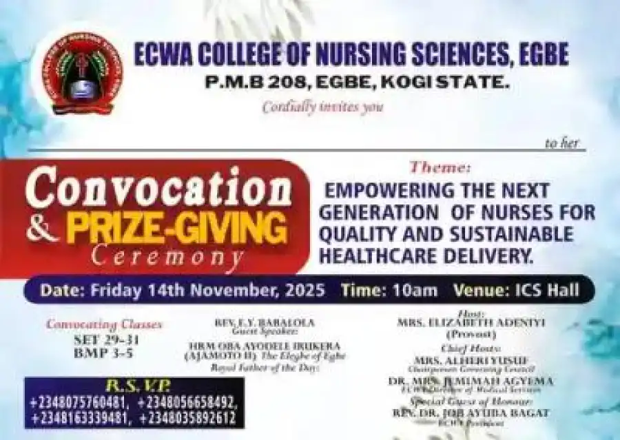 The management of ECWA College of Nursing Sciences, Egbe, Kogi State, has announced the date for its Convocation and Prize-Giving Ceremony, an event designed to celebrate academic excellence and the accomplishments of graduating students.