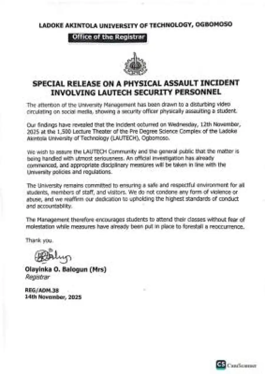 The Ladoke Akintola University of Technology (LAUTECH), Ogbomoso, has released an official statement addressing a viral video circulating on social media showing a security officer physically assaulting a student.