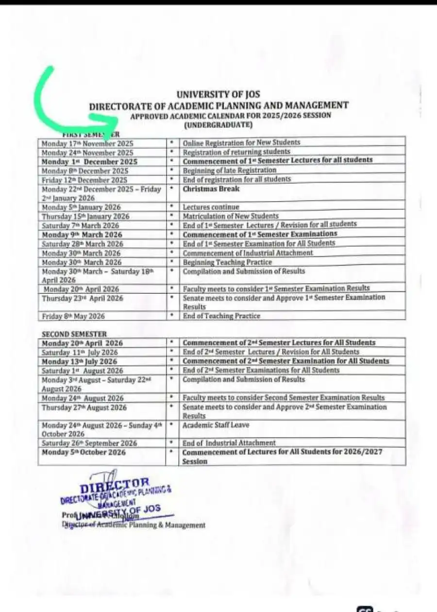 The University of Jos (UNIJOS), through its Directorate of Academic Planning and Management, has officially released the approved academic calendar for the 2025/2026 academic session for undergraduate students.