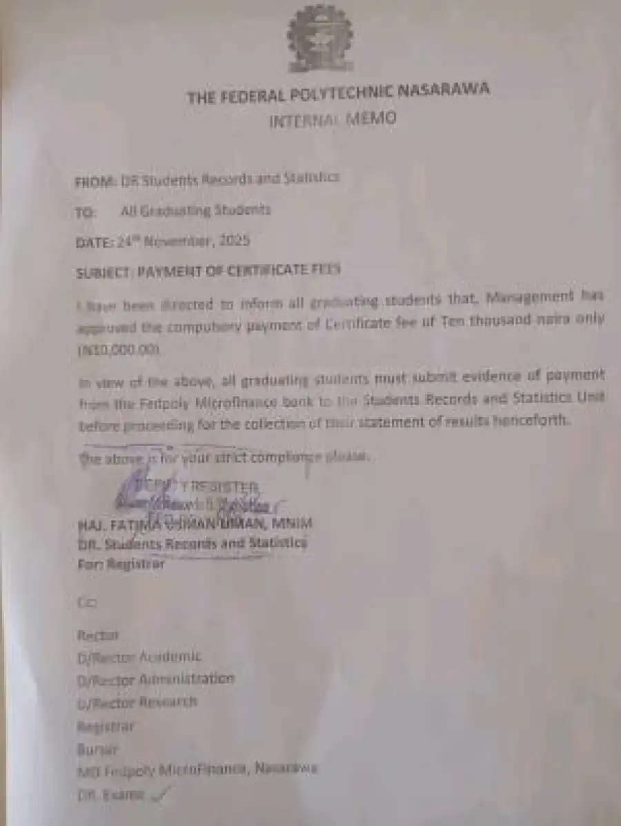 The Federal Polytechnic Nasarawa has issued an internal memo directing all graduating students to pay a compulsory certificate fee of ₦10,000.