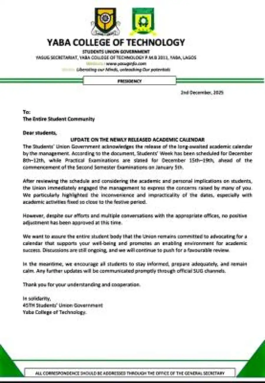 The Students’ Union Government (SUG) of Yaba College of Technology has released an official statement acknowledging the publication of the long-awaited academic calendar by the institution’s management.